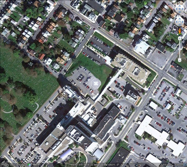 Hazards: HAZARDS include a two story brick building (boiler house) located ENE of the helipad, wires with orange marking balls to the SE, a radio tower 1.5nm E, and the hospital itself which is connected to the pad on W side. Winds in excess of 20kts from the NW can cause severe turbulence. West bound departures from the roof top pad with winds out of the west may encounter tailwinds while transitioning to forward flight due to the wind rolling and reversing direction off of the hospital.