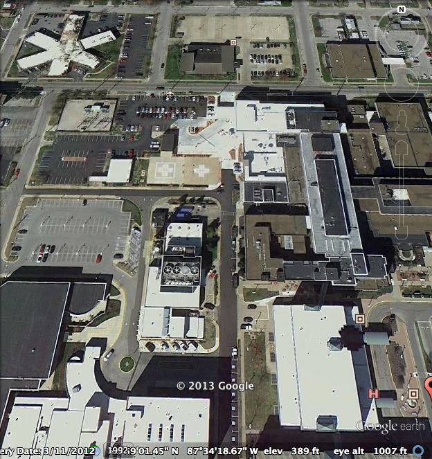 | Approach/Departure: | Ingress/egress route from west along Deleware Street, from south along Edgar Street, and from north over the wires. Contact Deaconess Security on IHERN (155.340) 20 minutes prior to arrival. Helipad inside of Evansville (KEVV) class D airspace, use KEVV approach and tower frequencies for arrival and depature communication. | |||||||||||||||||||||||||