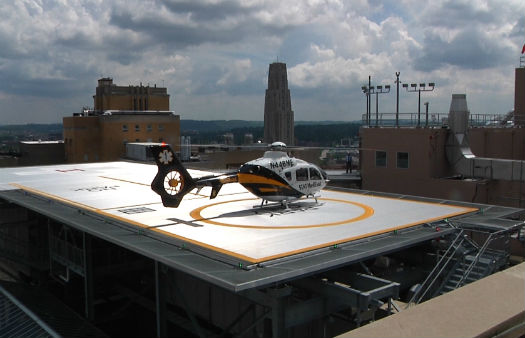 | Hazards: | Flagged crane just south of the pad. (7/13/15). HAZARDS: The elevator shaft/access adjacent to the S side of the helipad, HVAC equipment atop the D wing of the hospital approximately 45 yards SSE of the helipad, the UPMC Presbyterian Hospital Cupola and flag staff approximately 70 yards S of the helipad, UPMC Western Psychiatric Hospital approximately 65 yards ESE of the helipad. All significant obstacles are lit with red obstacle lighting. Direct flight over the residential area on the hillside located NNE of the pad should be avoided. | ||||||||||||||||||||||||||||||||