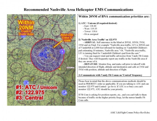Comments: | Communications (Nashville area and Vanderbilt helipads) Notification of inbound flights shall be made to Vanderbilt Flight Communications via radio or phone 20 minutes before arrival. If you need help unloading patients, please let us know in advance. Frequencies and Phone Numbers Primary Radio: 122.975 Phone: (800) 288-8111 Nashville Area Advisories 1. 20 NM and 10 NM: Call with position, altitude, destination and ETA. 2. 5 NM and/or 2 minutes: Contact Flight Communications with ETA. 3. Inform Flight Communications when on final approach. 4. When departing any Nashville hospital helipad, make advisory calls and inform Flight Communication on 122.975. Notes Hot off-loads (off-loading patients with rotors in motion) are not allowed without permission from the LifeFlight Communications Center. The pilot will remain on the helipad to relocate the aircraft if it is necessary. Wind readings from Flight Communications are not always available. Refueling is not available for visiting aircraft. Please review all information before arriving at Vanderbilt. |