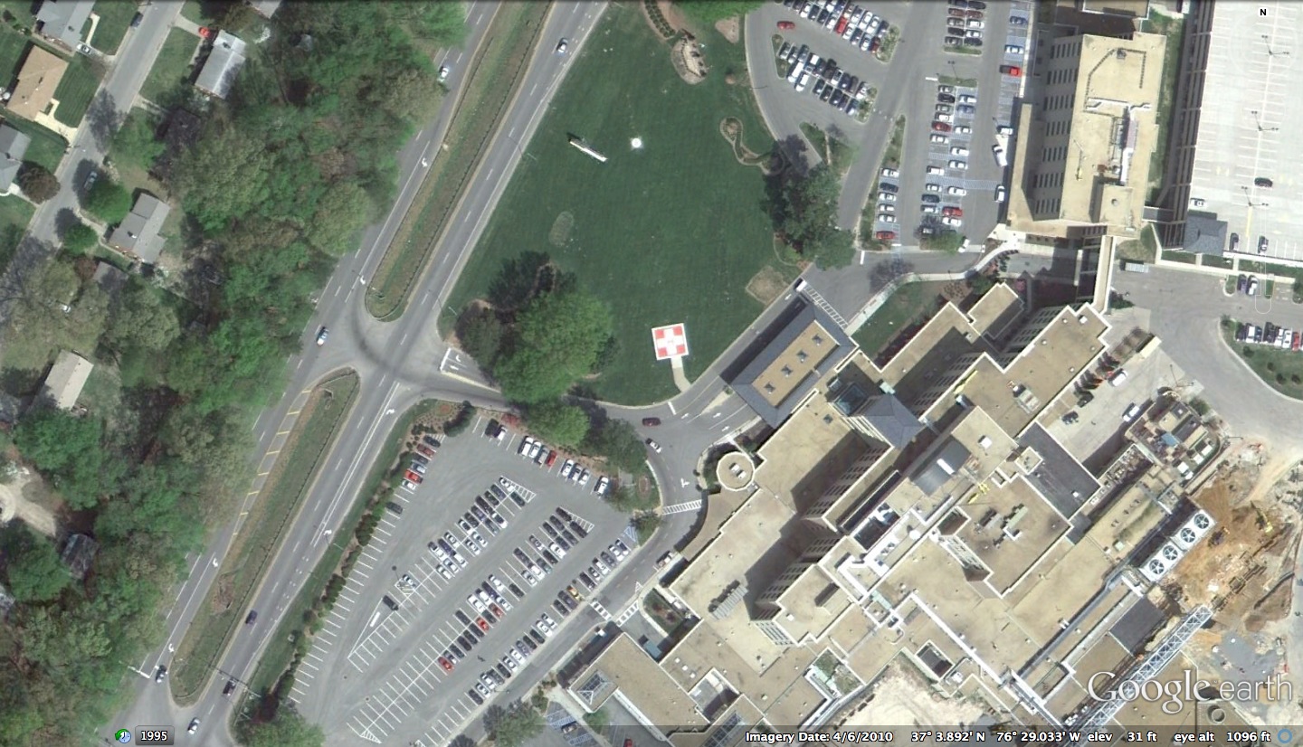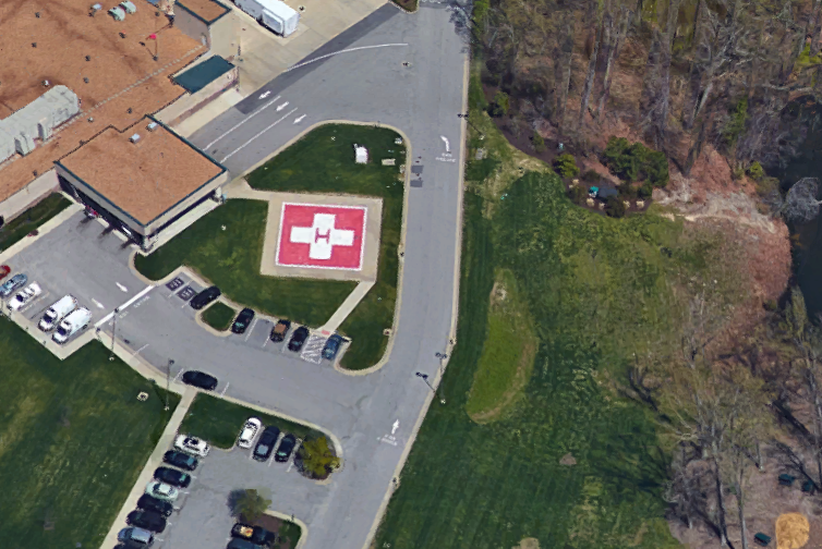 | Hazards: | Canopy over ambulance ramp close on west. Trees (S) and light poles. | ||||||||||||||||||